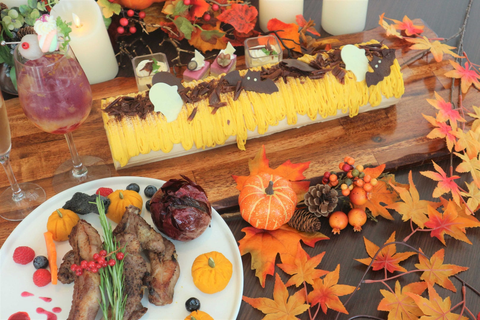 ブッフェでは、ダークな夜をイメージした「スペアリブのブルーベリーソース」、カボチャのモンブランクリームをふんだんに使用した「パンプキンロールケーキ」、ゴーストやコウモリをかたどったチョコレートの飾りがかわいらしい「ガトーショコラ」など、ハロウィンにちなんだお料理をご用意しております。