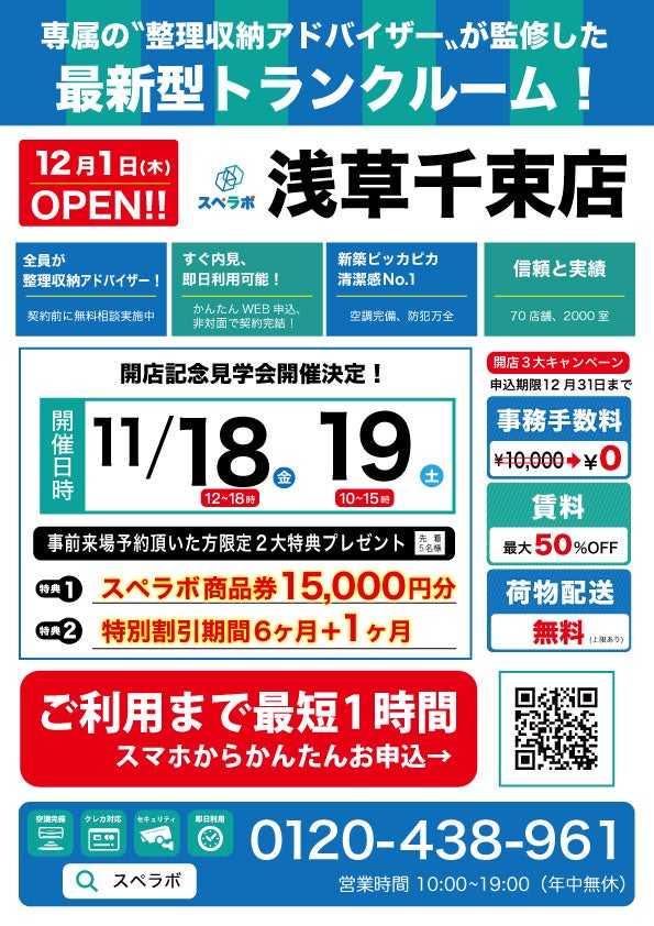 【12月1日(木)オープン】見学から契約、解約まで完全非接触・非対面、お申し込みからご利用まで最短1時間!都内、大阪などにて絶賛運営中のトランクルーム【スペラボ】が台東区千束に出店!