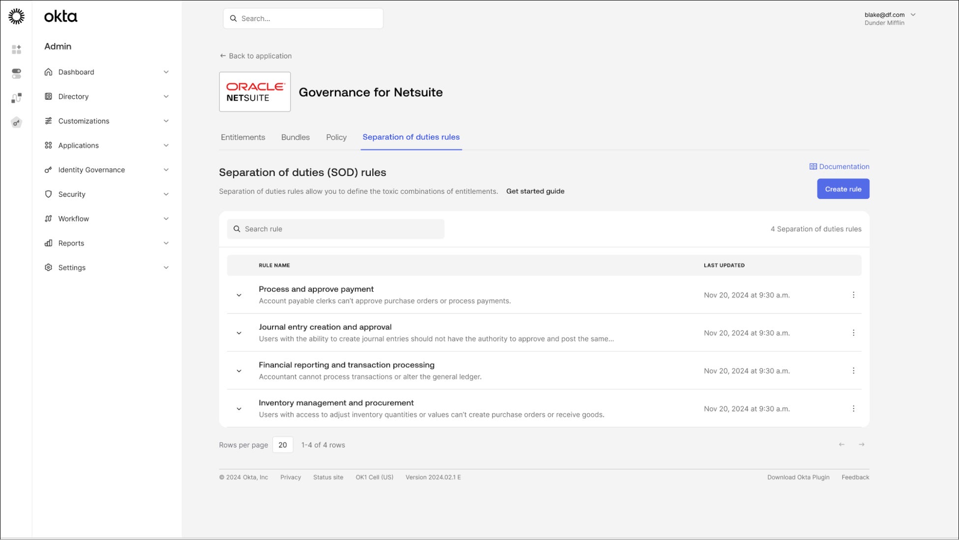 本日より一般提供プレビュー(GAプレビュー)として利用可能になったOkta Identity Governanceの新機能「職務の分離(SoD)」は、ユーザーが矛盾したアクセス権を持ってしまい、セキュリティリスクやコンプライアンス違反につながるのを防止することができます。事前定義された業務ルールに基づいてSoDポリシーを適用することで、不正防止、法令遵守、内部脅威の軽減を実現します。