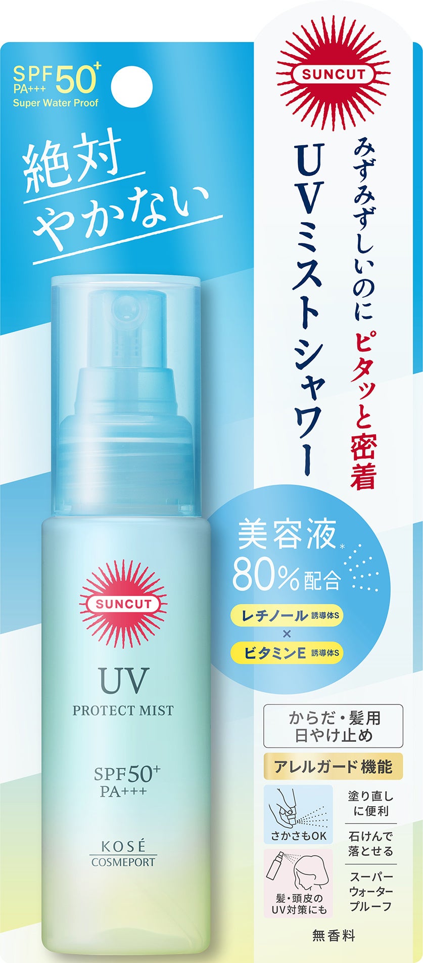 このような背景から、『サンカット®』より美容液*80%で、素肌のように軽くてベタつかないミストタイプの日やけ止め「プロテクトUV ミスト」を発売いたします。 【SPF50+ PA+++】の紫外線カット効果と肌への高い密着性を実現した本品で、日やけ止めに簡便性と肌効果を求める生活者のニーズに応えてまいります。