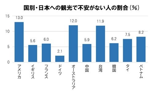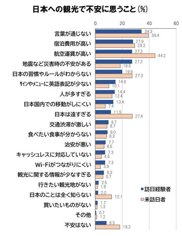 不安の内容は訪日経験者と未訪日者で異なる傾向になっており、「航空運賃が高い」、「日本は遠すぎる」、「日本の習慣やルールがわからない」については未訪日者のほうが不満に思っている人が多いという結果になりました。