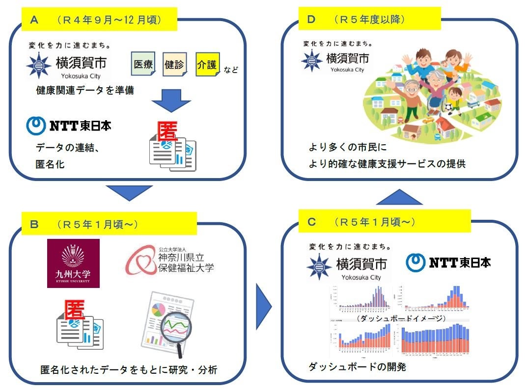 横須賀市と東日本電信電話株式会社(以下、NTT東日本)、国立大学法人九州大学(以下、九州大学)、公立大学法人神奈川県立保健福祉大学(以下、県立保健福祉大学)が連携して、横須賀市民のヘルスケアデータを連結、分析し、健康支援事業を推進していきます。