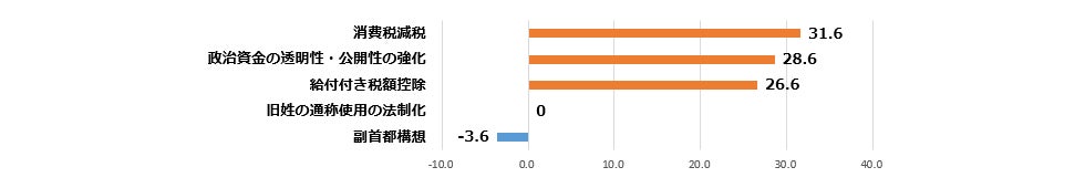 「自民に進めてほしい政策」と「中道に反対してほしい政策」の差(ネットスコア)をとると、上位は「消費税減税」+31.6ポイント、「政治資金の透明性・公開性の強化」+28.6ポイント、「給付付き税額控除」+26.6ポイントとなった。低い順では、「特にない」「わからない」を除けば、「副首都構想」-3.6ポイント、「旧姓の通称使用の法制化」±0ポイントなどとなった。