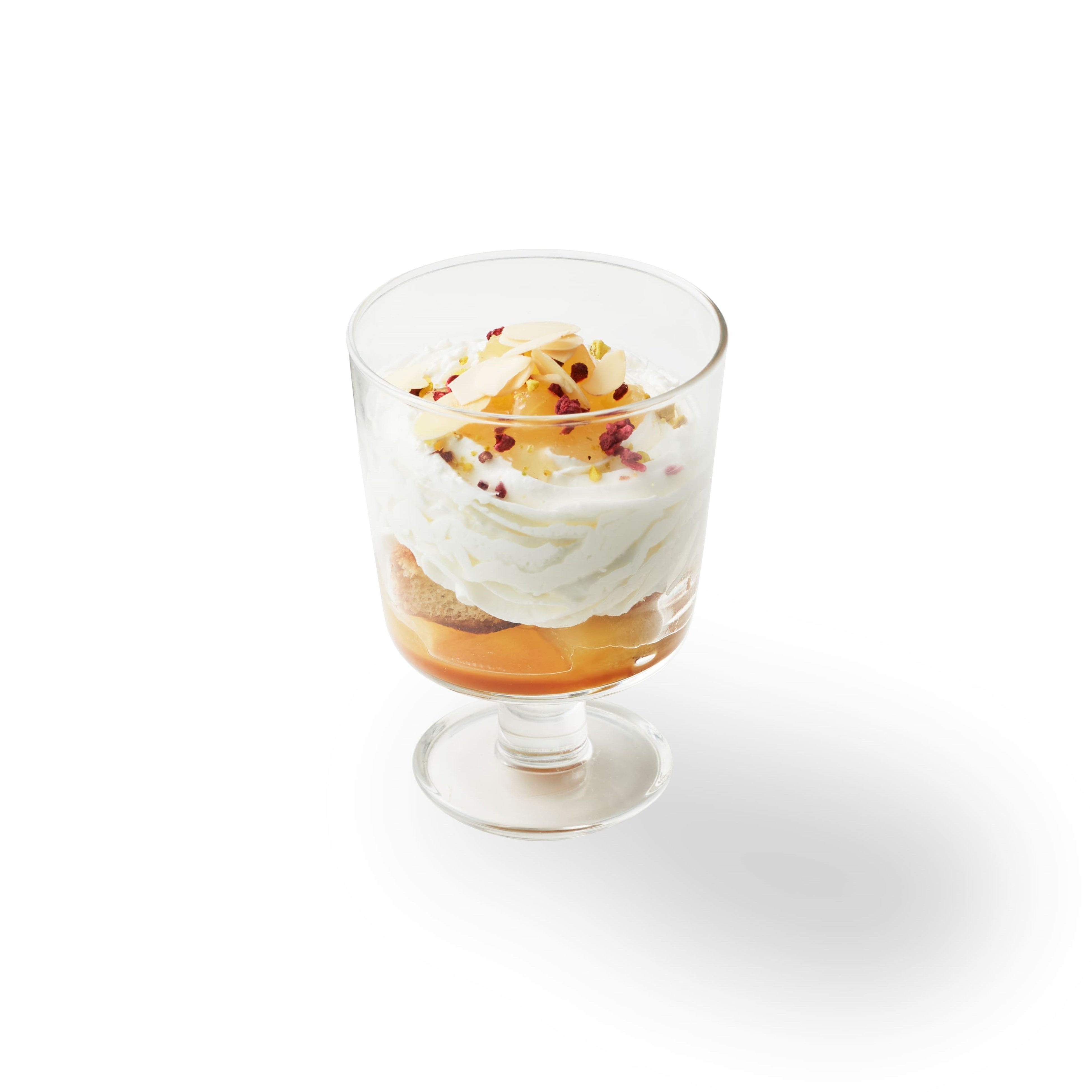 りんご風味のシフォンケーキとりんごのシロップ漬けに、たっぷりのホイップクリームをトッピング。ほろ苦いキャラメルソースと一緒に召し上がれ。