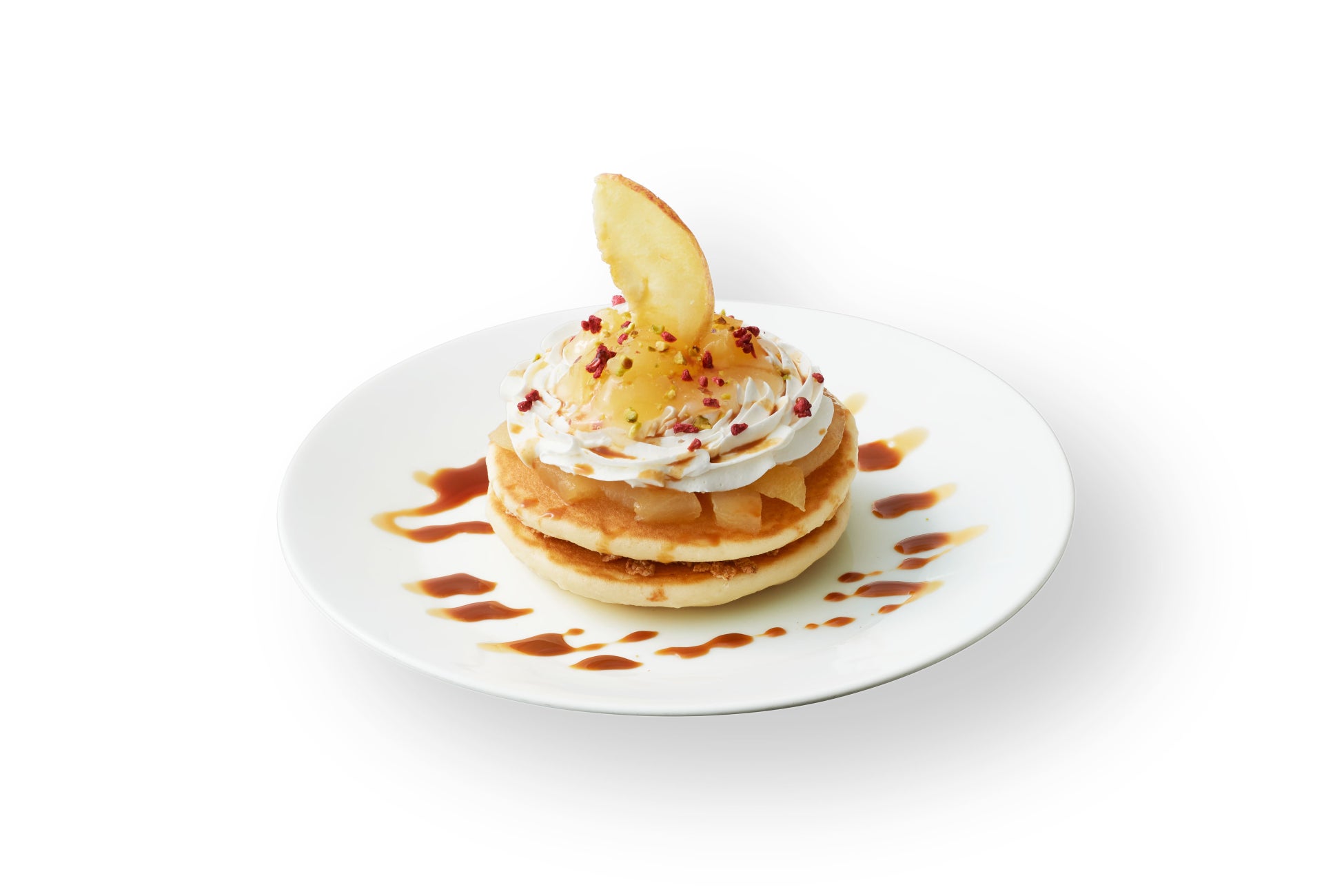 シロップ漬けのりんごとホイップクリームをたっぷり使ったパンケーキ。シャキシャキのりんごと間に挟んだもち麦のフレークが絶妙な食感です。