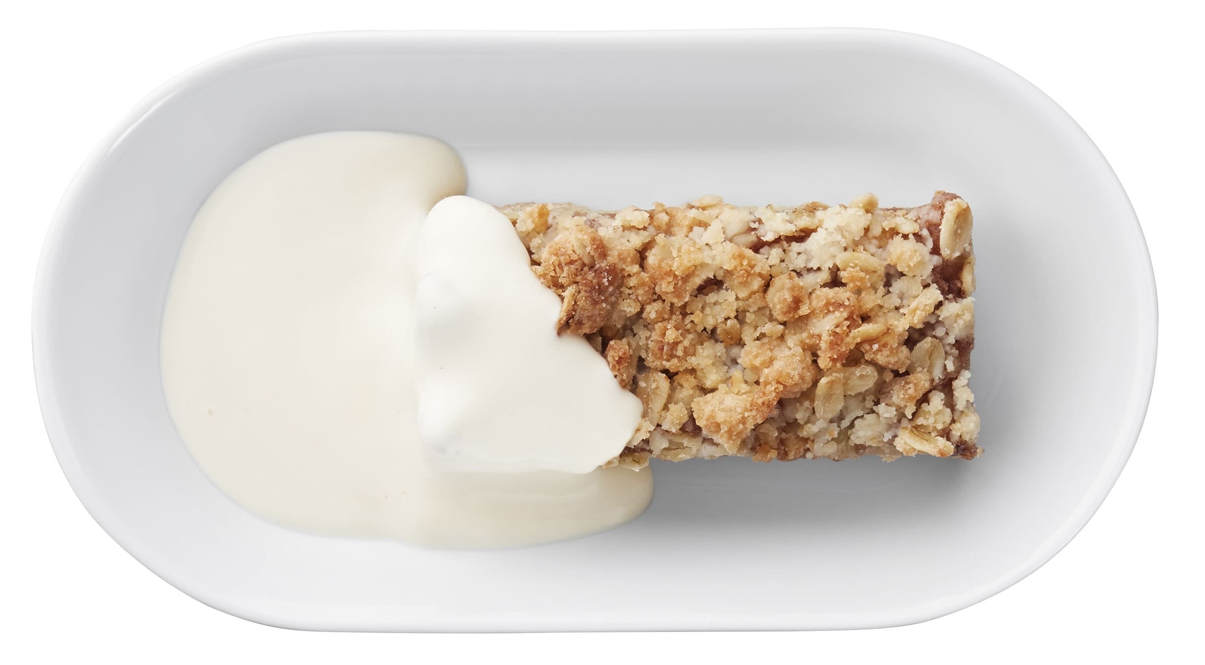 りんご入りのバターケーキにクランブルをトッピング。バニラソースをたっぷりかけたアップルケーキです。
