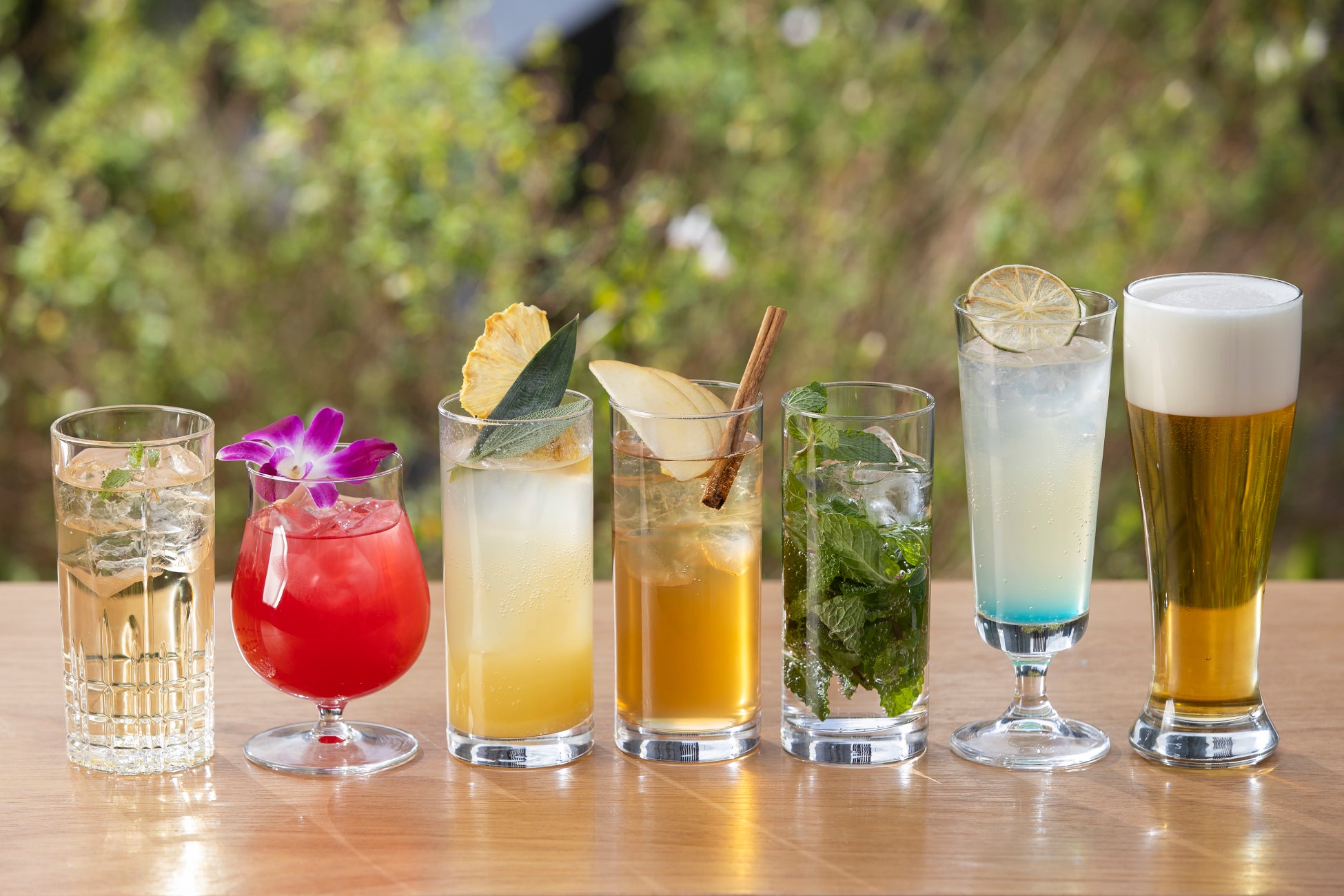 (左から)檜のハイボール、パッションブリーズ(ノンアルコール)、パイナップル&トニック(ノンアルコール)、銀ぱちセイロンティーモスコミュール、フローラルモヒート、スカイパローマ、ビール