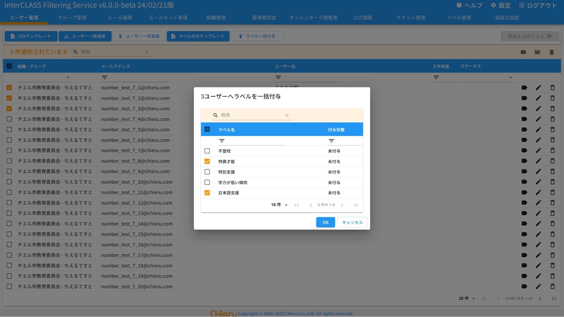 新たに、教員や生徒にラベルを紐づけて管理できる機能が追加されました。ラベルを設定することで、該当生徒の端末利用状況を絞り込んでダッシュボード上で確認でき、利用時間帯や曜日の傾向などを把握することが可能になります。ラベルはグループ単位でも設定できるため、「理系クラス」といったカテゴリ別の管理や表示にも活用できます。