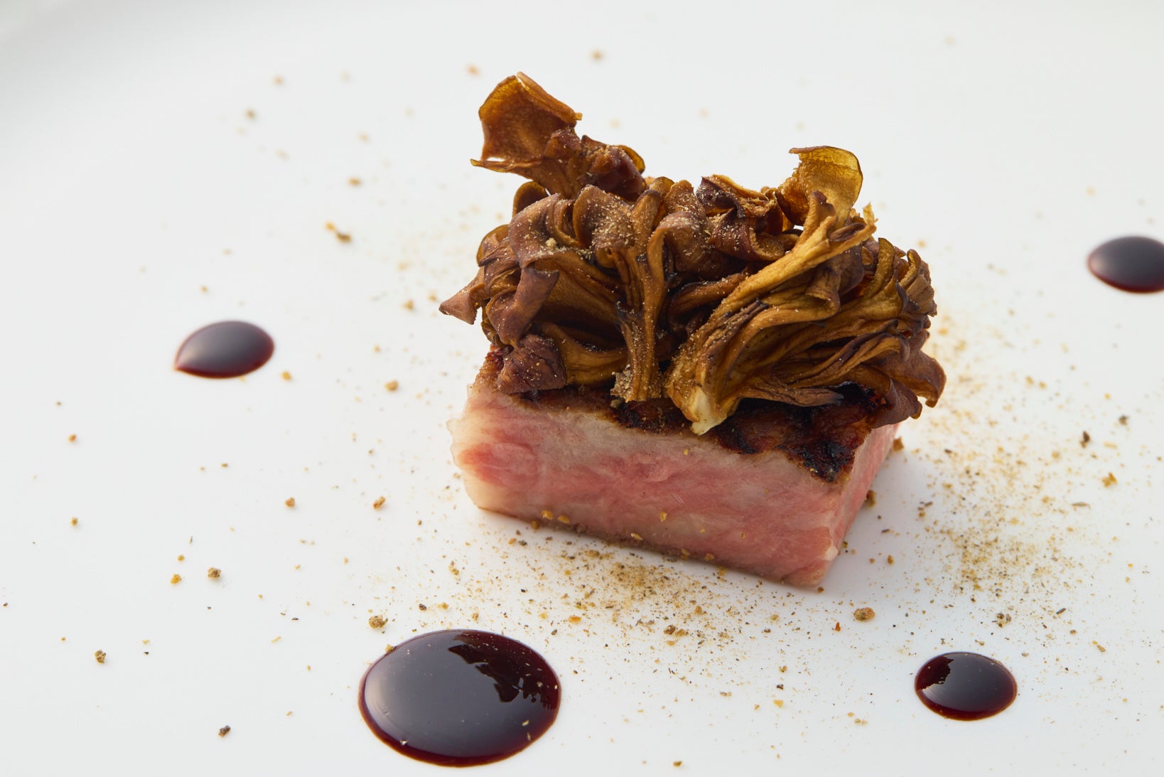 「松阪牛のグリル 大黒舞茸 島胡椒のアクセント」は芳醇な旨味を持つ松阪牛を香ばしくグリルし、香り豊かな大黒舞茸を添えました。深みのある赤ワインソースが肉の美味しさを引き立てます。