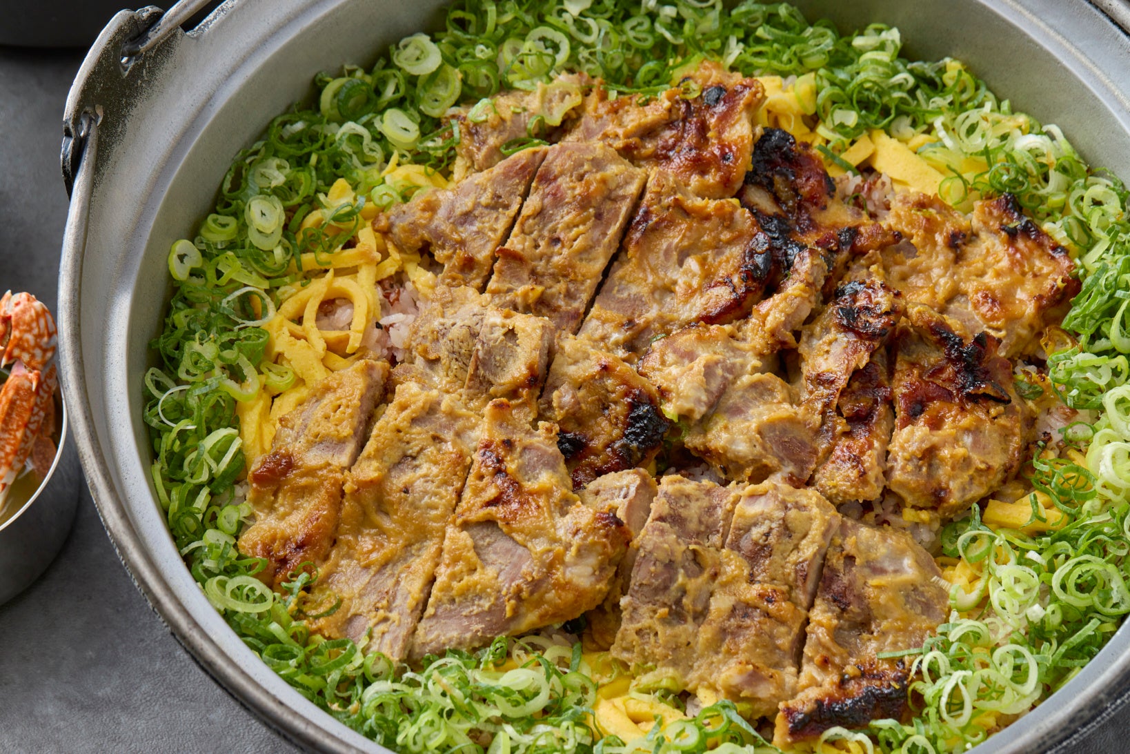 ディナーで提供する「黒米の味噌豚焼きまぶし飯」は、黒米と十五穀米をブレンドした御飯に特製の味噌漬け豚を乗せた料理です。まずはそのまま丼で、次に白出汁と薬味を加えて茶漬け風に。二通りの美味しさをご堪能いただける、シェフおすすめの一品です。