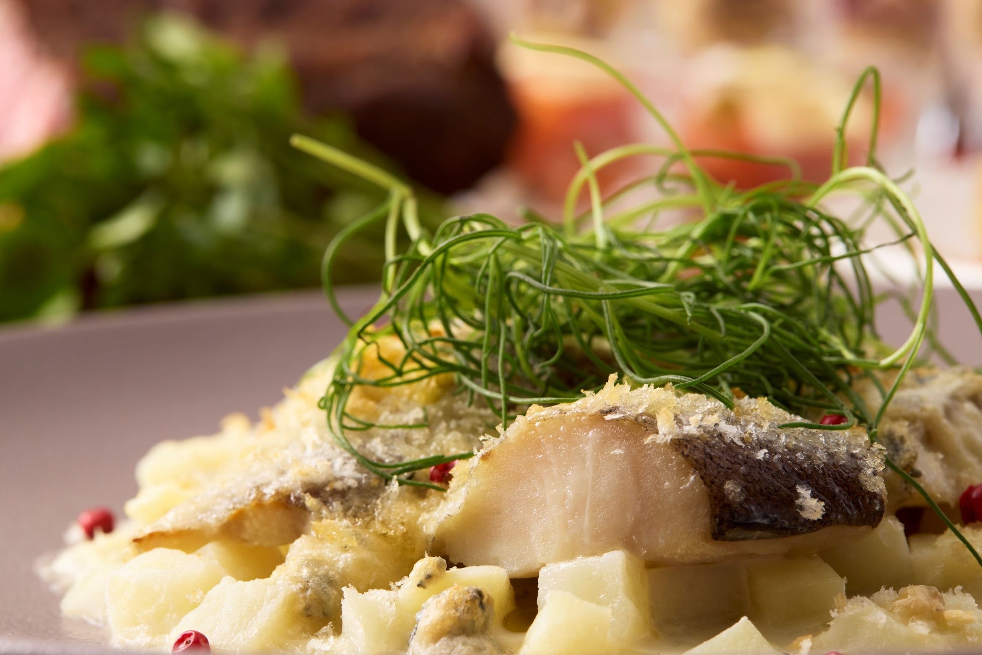 「鱈とジャガイモのゴルゴンゾーラ」は濃厚なソースに合うよう、鱈とポテトはシンプルに熱をいれるだけ。クリームチーズをワインでのばし、ゴルゴンゾーラチーズ、パン粉をのせてオーブンでサクサクに焼き上げました。オカヒジキとレッドペッパーが彩を添えます。