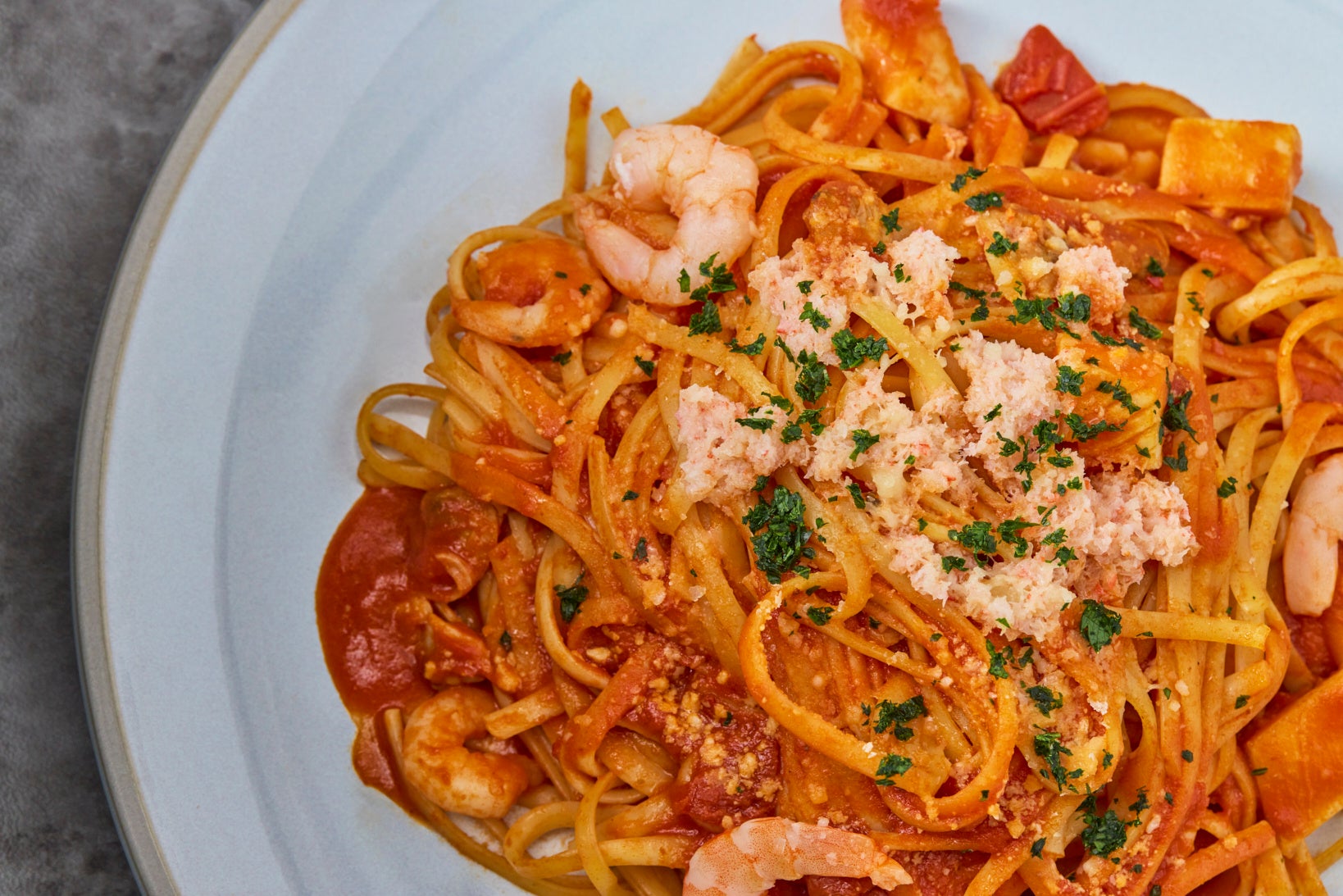 「漁師風」を意味し、魚介類を使ったトマトソースのパスタ「ペスカトーレ」。エビ、イカ、アサリを使用し、ズワイガニフレークを贅沢に使用しました。ソースがよく絡むリングイネのパスタで、特製トマトソースと絡めて召し上がりください。