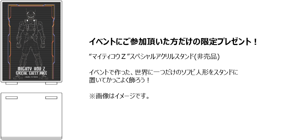 東京・森下のホビー工場”アルチザンデザインスタジオ”でおはスタの大人気ヒーロー”マイティコウZ”のソフビ人形を自分の手で作成!ご自身がペイントした世界に一つだけのソフビ人形、ここでしか手に入らないマイティコウZソフビ人形限定カラー(白)、さらに、作った人形を飾る事のできる、アクリルスタンド(非売品)もお持ち帰りいただけます。