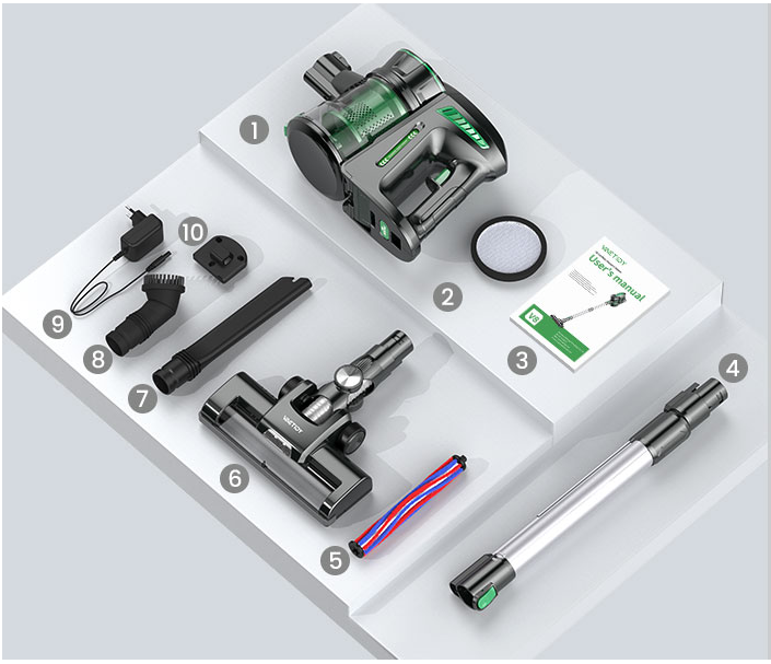 付属品:HEPAフィルター、伸縮ホース、ローラーブラシ、モーター駆動ヘッド、隙間ノズル、丸ブラシ