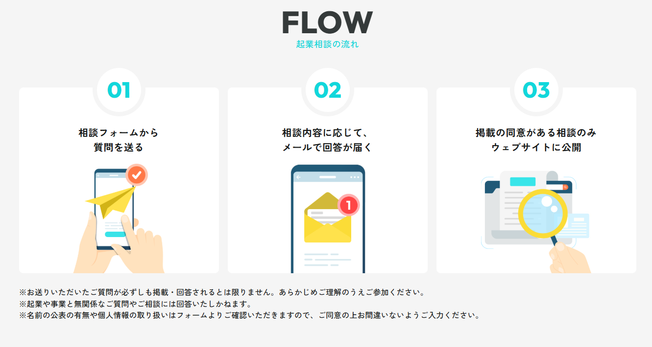 本サービスでは、起業に関するお悩みや質問を気軽にお送りいただけるよう、シンプルな3ステップで相談が完結します。