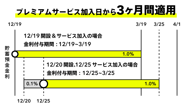 プレミアムサービス加入日から3ヶ月間、貯蓄預金金利1.0%(税引後 0.796%)を適用