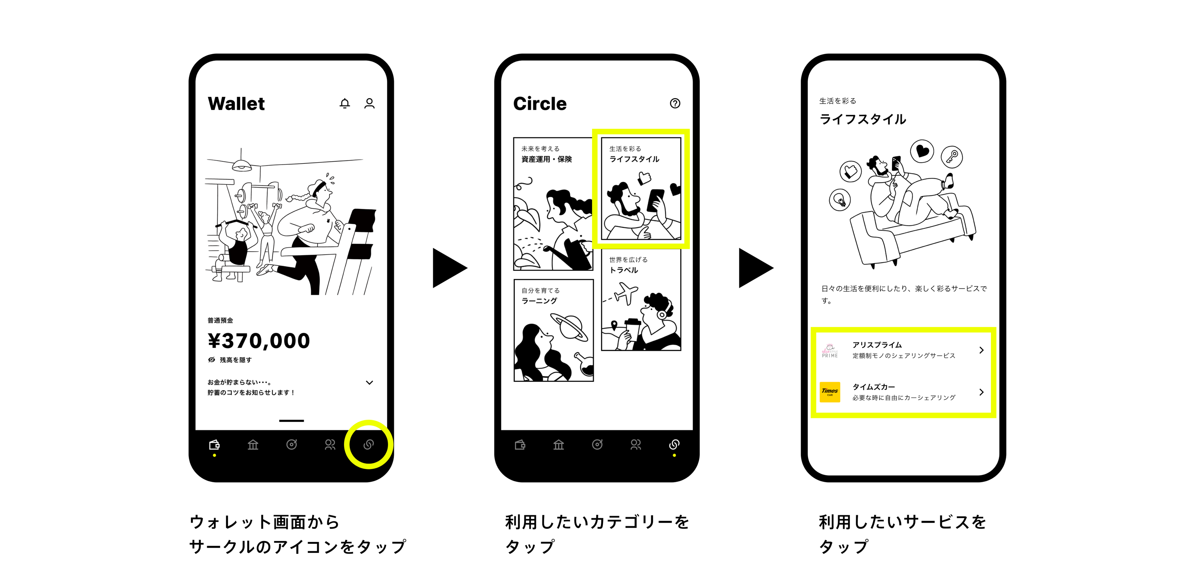 お客さまは、みんなの銀行アプリのサークル画面から利用したい提携事業者のサービスにアクセスすることで、お得な情報や特典を手軽に受け取ることができます。