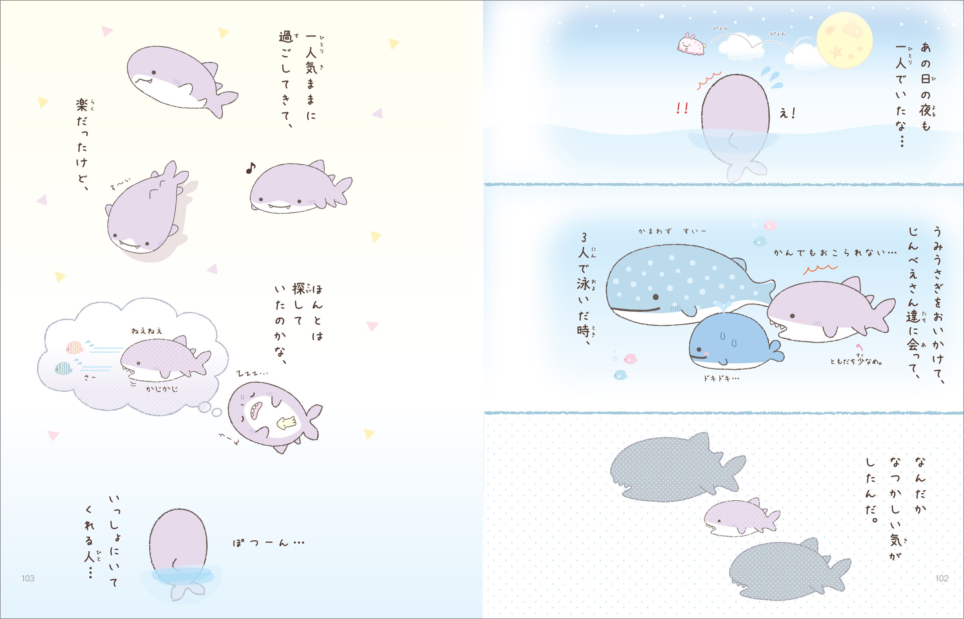 不思議なお友だちとの出会いや、人気の新キャラクター「さめさん」の描き下ろしストーリーも。ずっとひとりだったさめさんにさりげなく寄り添うじんべえさんの優しさにグッときます。