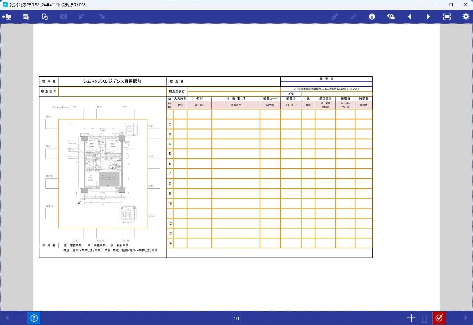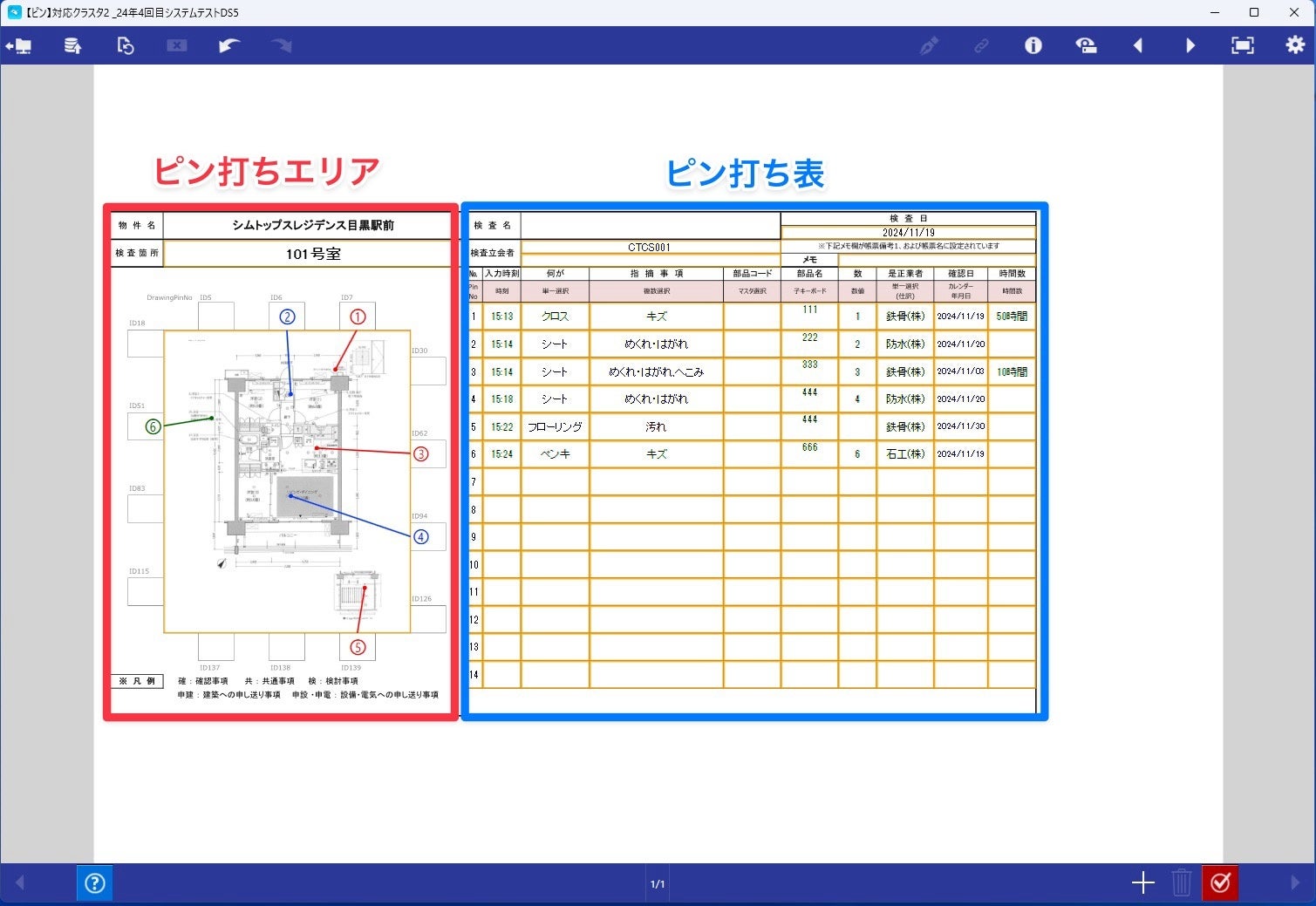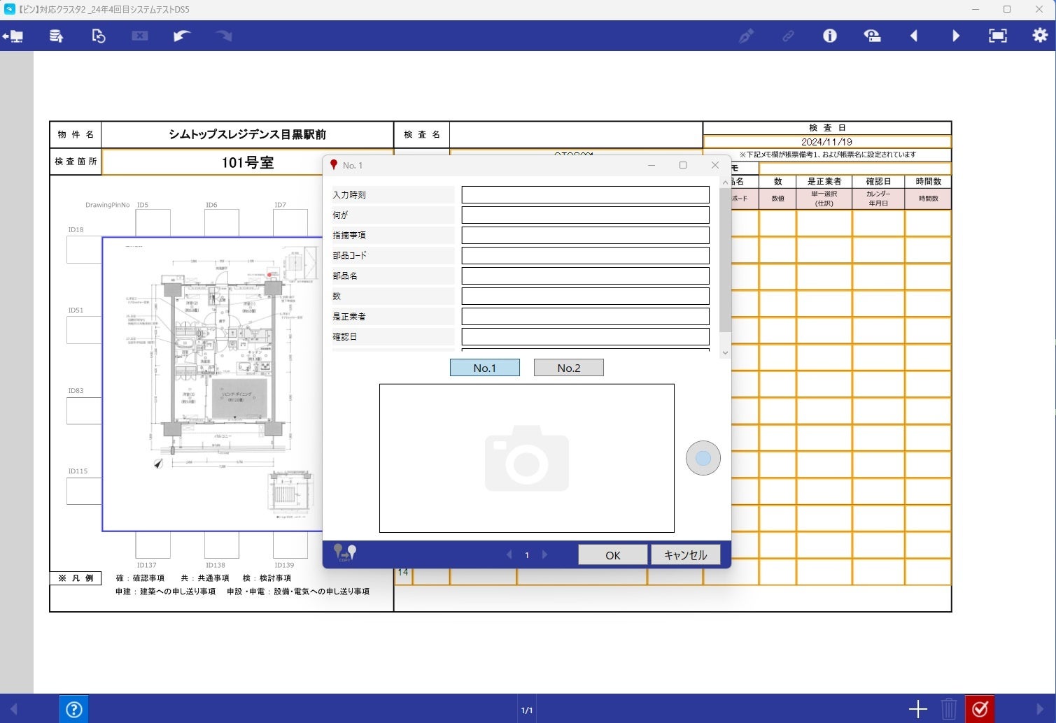 紙の図面上でその場所を●などでマークし、その場所から線を引き図面の外に番号を記載し、対応する別表に該当箇所の不具合内容の詳細の記録や写真の添付を行う業務の効率化を目的とした機能です。