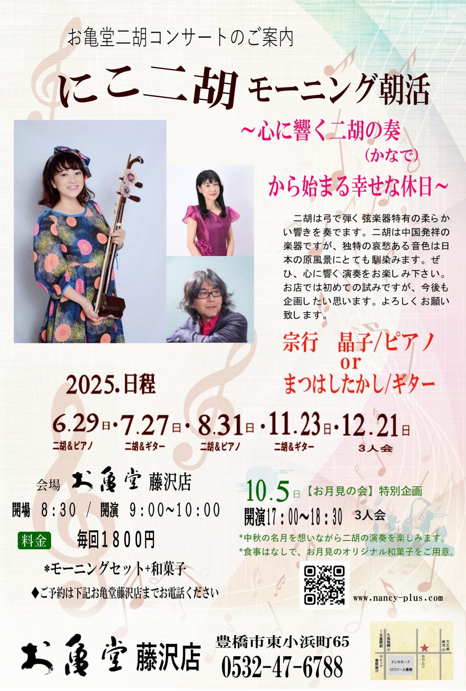創業70年以上、地域に根ざした和菓子店・株式会社お亀堂(本社:愛知県豊橋市/代表取締役:森貴比古)は、藤沢店にて「にこ二胡モーニング朝活」を開催いたします。