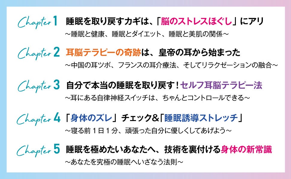 耳への刺激によって、自律神経を整え、睡眠の質・体質改善に働きかけるリラクゼーションサロン。日本初のイヤースティムレーションを独自に開発。40年の歴史をもつ、リラクゼーションのパイオニア「エーワンアカデミー」監修のもと、研鑽を積んだスタッフが施術にあたっている。本書では、その技術を惜しみなく公開、自宅でできるイヤーエステで毎日の睡眠の質をあげていくメソッドを紹介している。