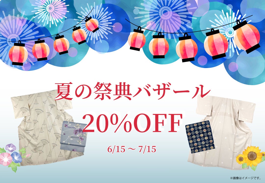 リユース着物「たんす屋オンラインストア」では6月15日(土)から7月15日(月)の期間「夏の祭典バザール20%OFF!」を開催中です。