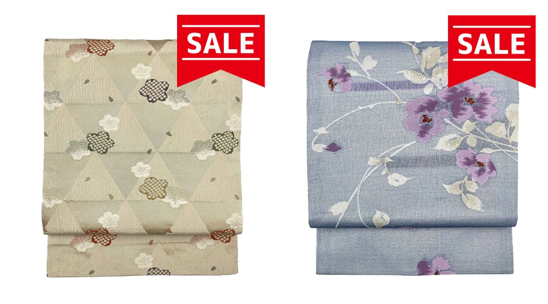 左:京袋帯 ベージュ カジュアル 桜 鱗 鹿の子 22,000円(税込)→17,600円(税込)【ポイント還元10%】