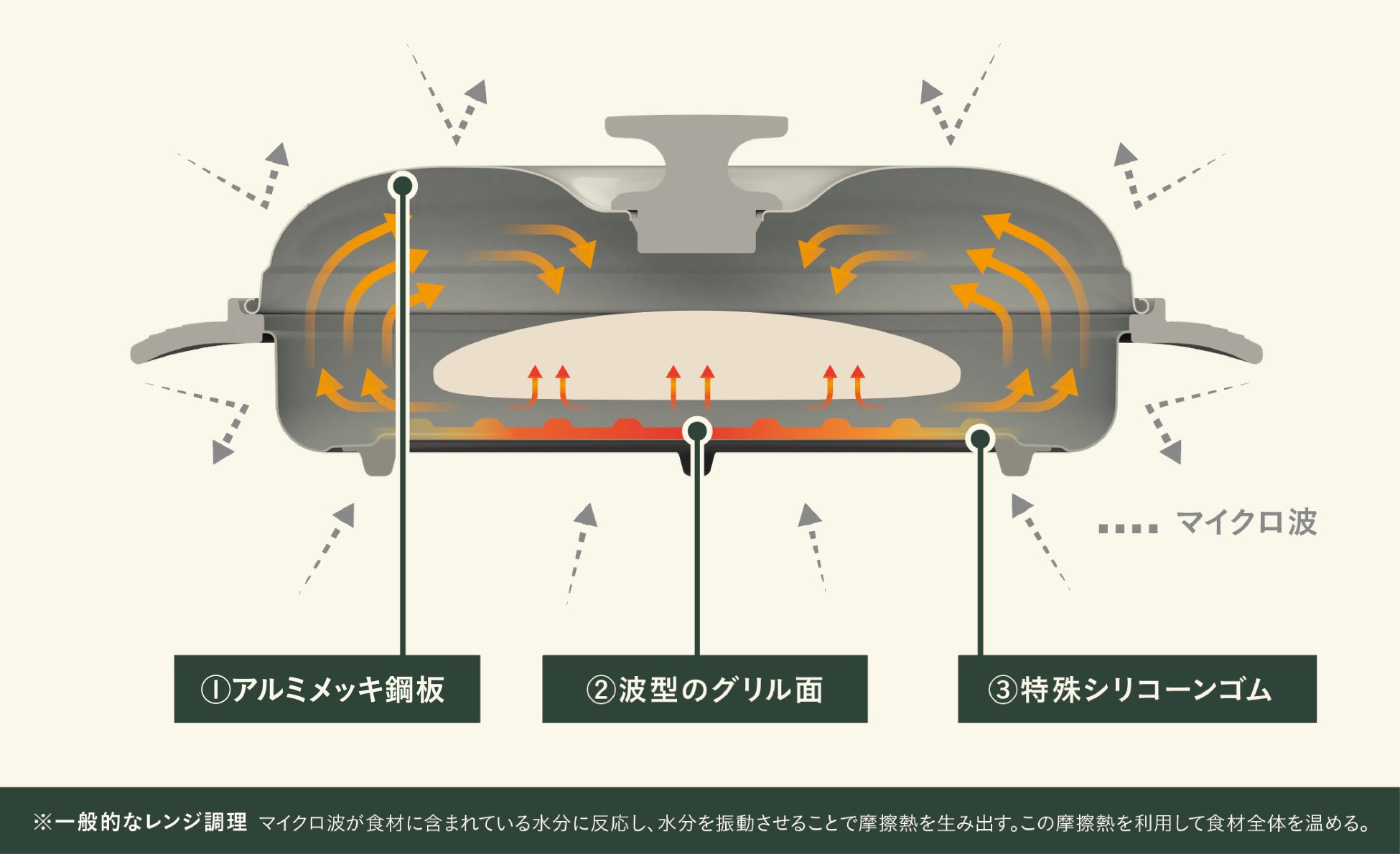 マイクロ波を熱に変換し、グリル面に熱を伝えることで、電子レンジで「フライパン」のような調理が出来ます。