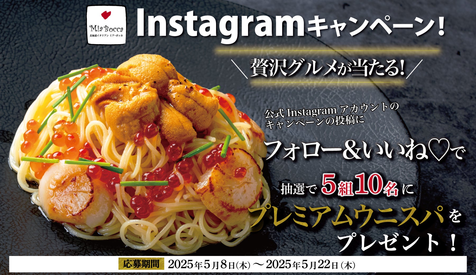【北海道イタリアン ミア・ボッカ】プレゼントキャンペーン!公式インスタグラムの\フォロー&いいねで簡単応募/贅沢すぎる期間限定パスタ「プレミアム ウニスパ」が抽選で 5組10名様 に当たるチャンス!