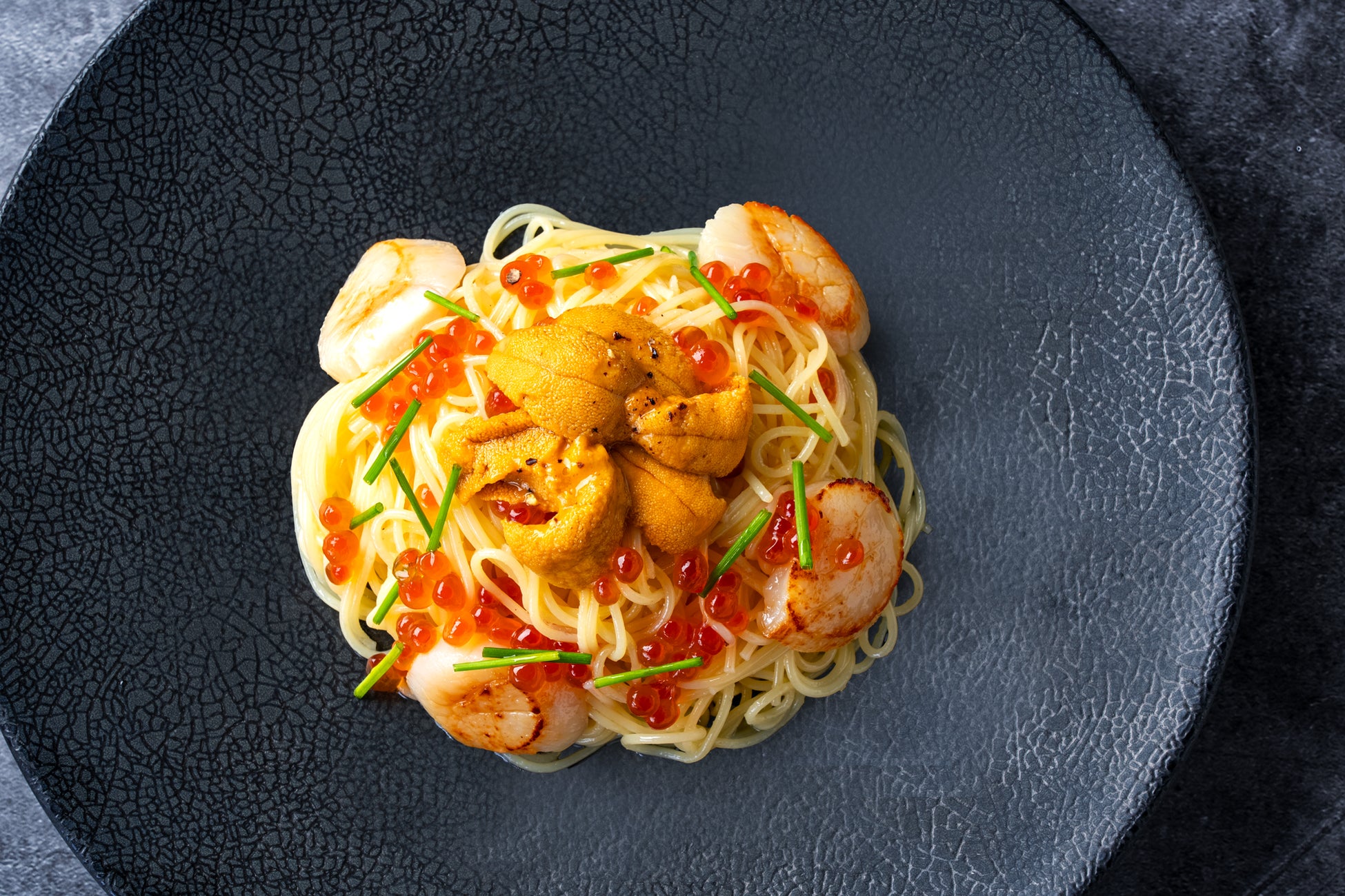 オリーブオイルをベースに昆布だし、帆立だしを合わせたソースをカッペリーニという細いスパゲティィに合わせ、ミョウバンを使わないウニ本来の味を楽しめる「塩水ウニ」と、ぷりぷりの「北海道産帆立」、「いくら」をのせた一皿。