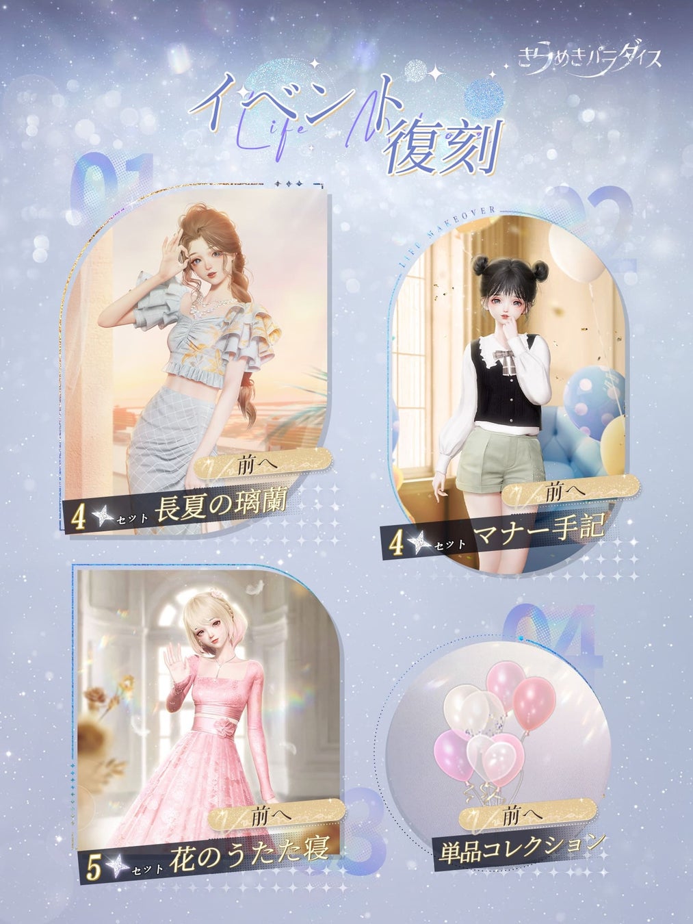 VVANNA STUDIOは、次世代ガールズドリームRPG『きらめきパラダイス~自由につくれる夢の世界へようこそ~』において、星6セットコーデ「マリンドーム」と星5セットコーデ「夢仮面」が登場することをお知らせします。また、ゲーム内7日間、14日間イベントも開催されるので、ぜひこの機会にセットコーデを集めてください!
