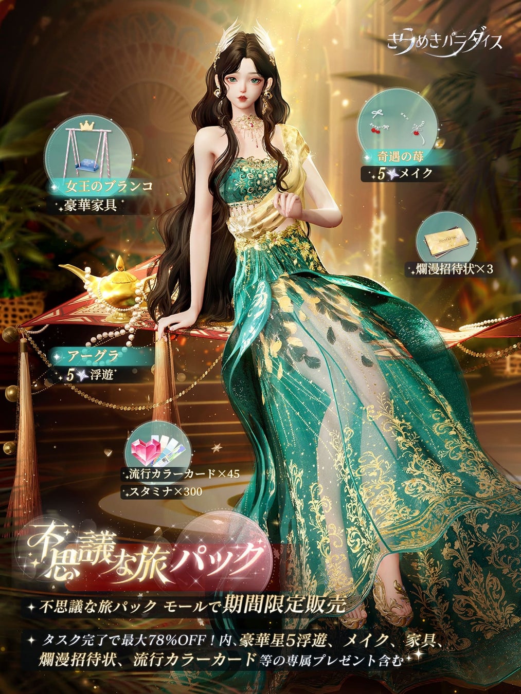 パックには、星5浮遊『アーグラ』、星5メイク『奇遇の苺』、豪華家具『女王のブランコ』、爛漫招待状×3、スタミナ×300、流行カラーカード×45など、豪華報酬が盛りだくさん。特に星5浮遊は、専用動作ポーズを楽しむことができますので、ぜひゲーム内でチェックしてくださいね。