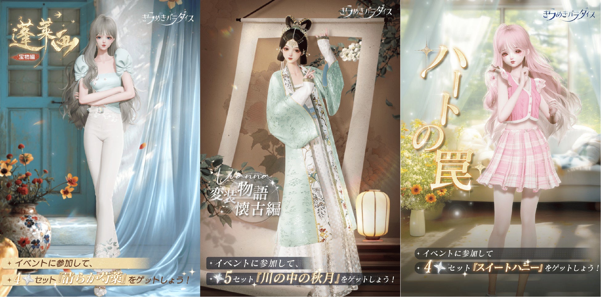 9月13日から『蓬莱画・宝物編』、9月19日から『変装物語・懐古編』、9月27日から『ハートの罠』が開催されます!期間限定星5セット「川の中の秋月」、や星4セット「清らか芍薬」、「スイートハニー」を無料で入手できるので、ぜひ参加してみてください!
