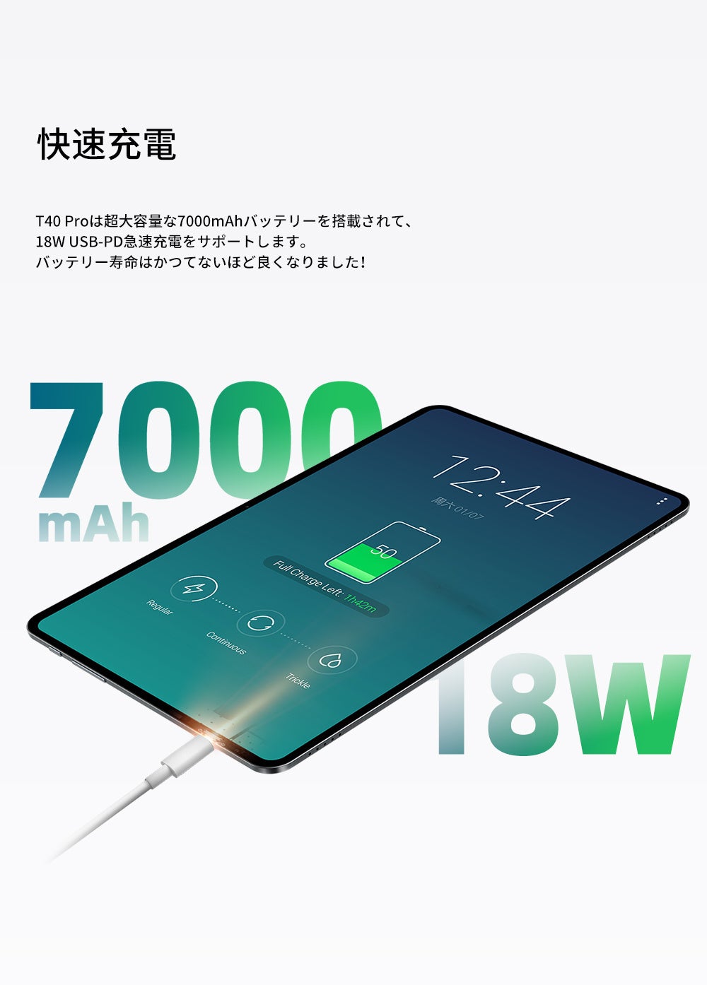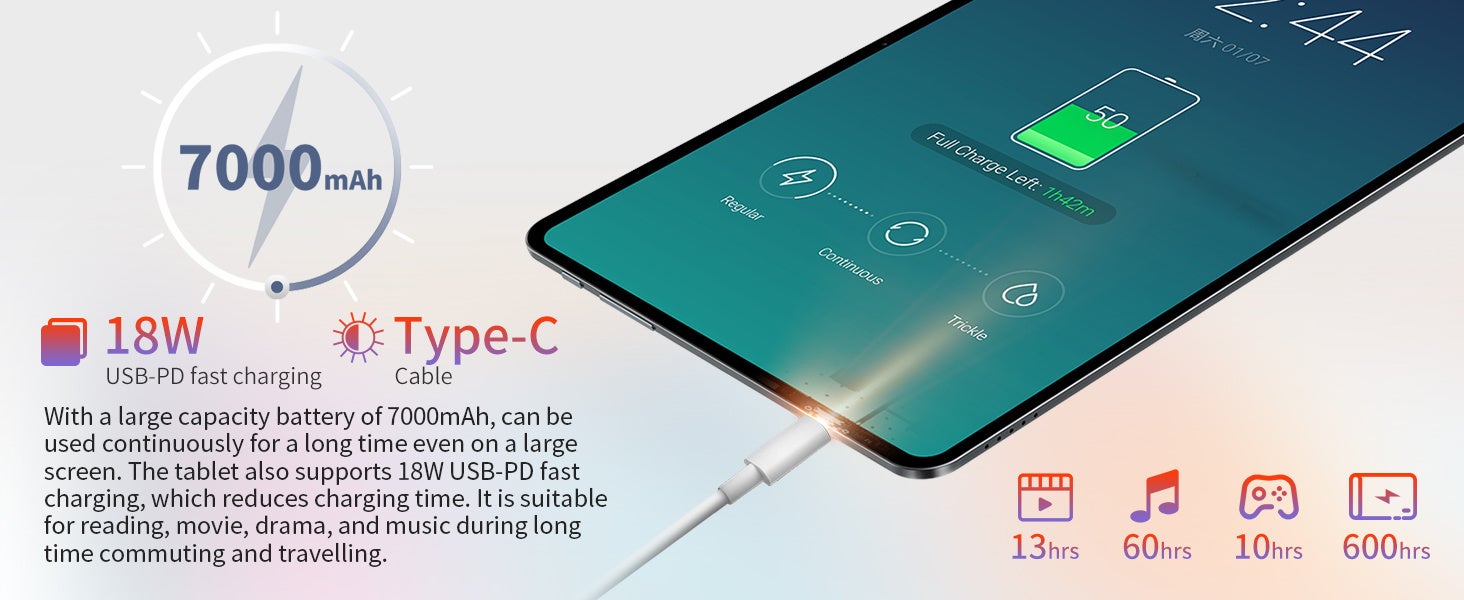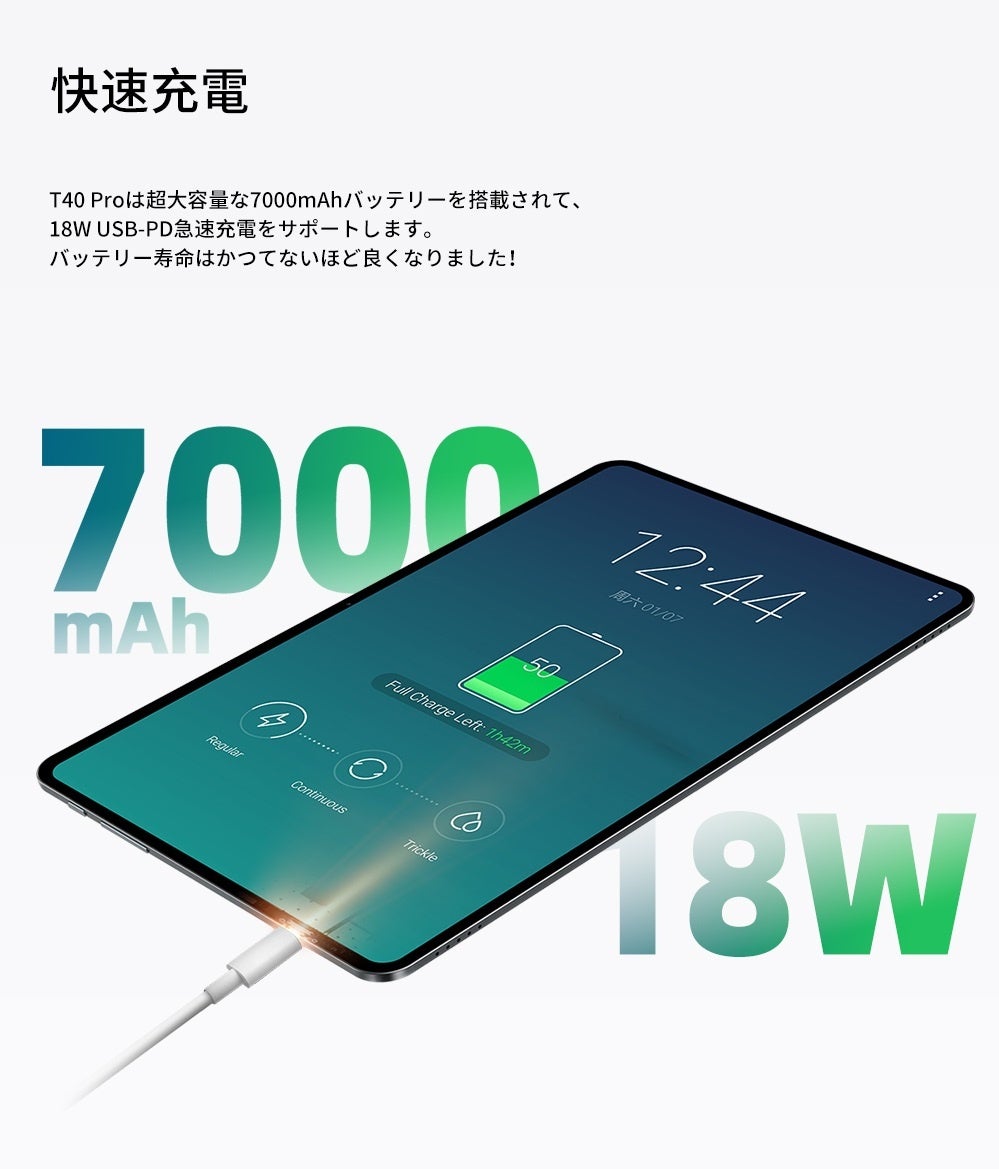 7000mAhのバッテリーが搭載されています。 18W USB-PD急速充電をサポートしているため、大体4時間で満充電になる可能です。ゲームが必要なときにタブレットをすぐにフルに戻すことができます。より長い待機時間を提供できます。