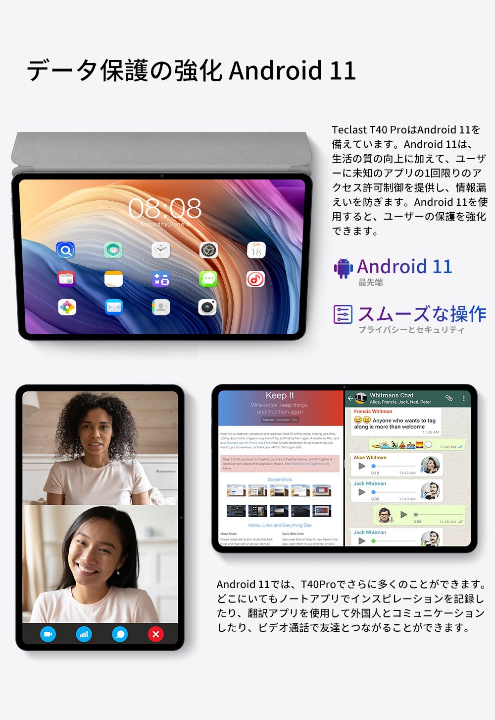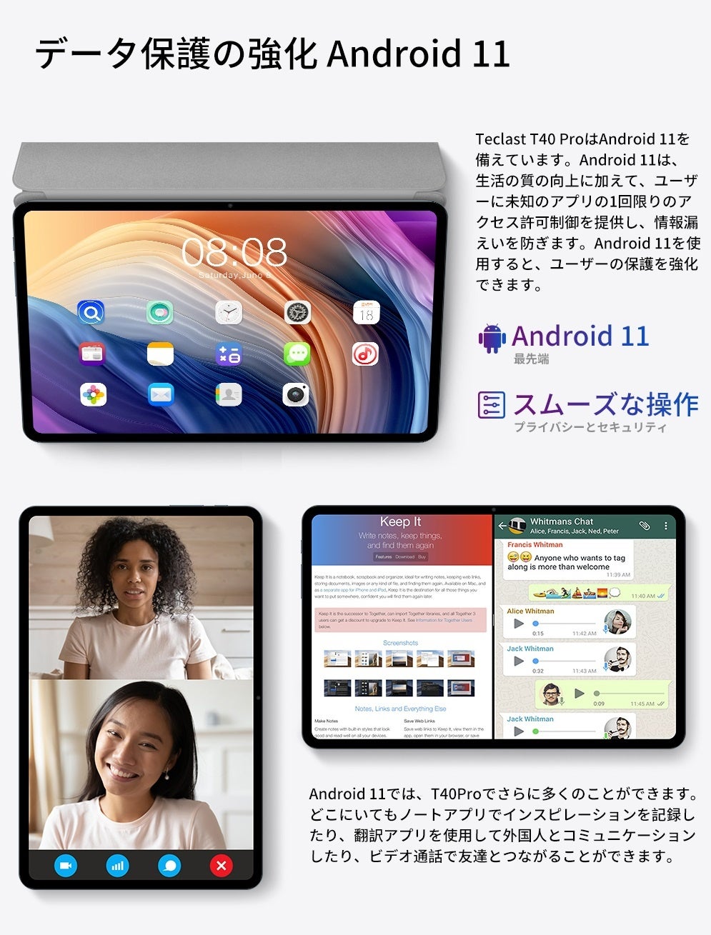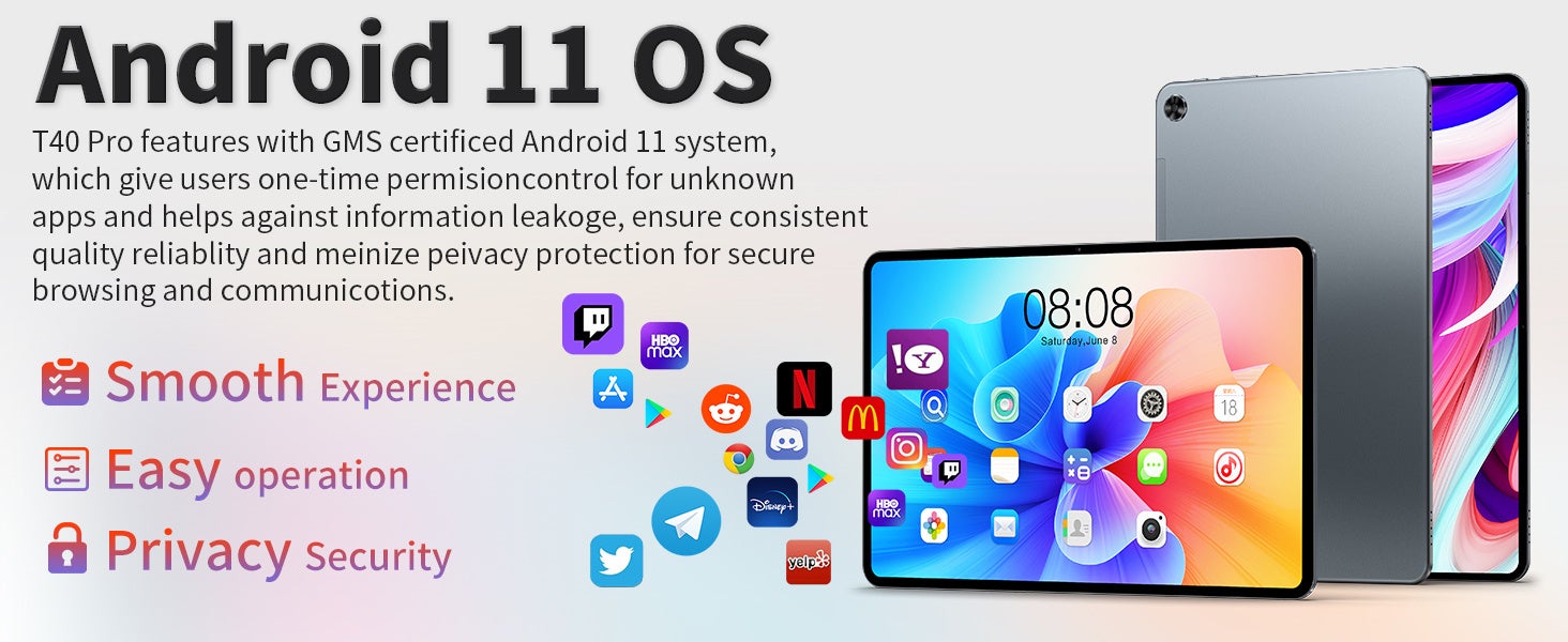 最新バーションのAndroid11オペレーティングシステムを搭載されており、バブル機能、デバイスコントロール、スクリーンレコードなど新機能で、タブレットをよりスムーズに操作可能になります。GoogleのGMS認証済み、Google Play ストアから全てのお気に入りのアプリにアクセスできます。アプリケーションも快適にご利用できます。GPS機能も付き、タブレットにオフラインマップをダウンロードすると、Googleマップが利用できます。