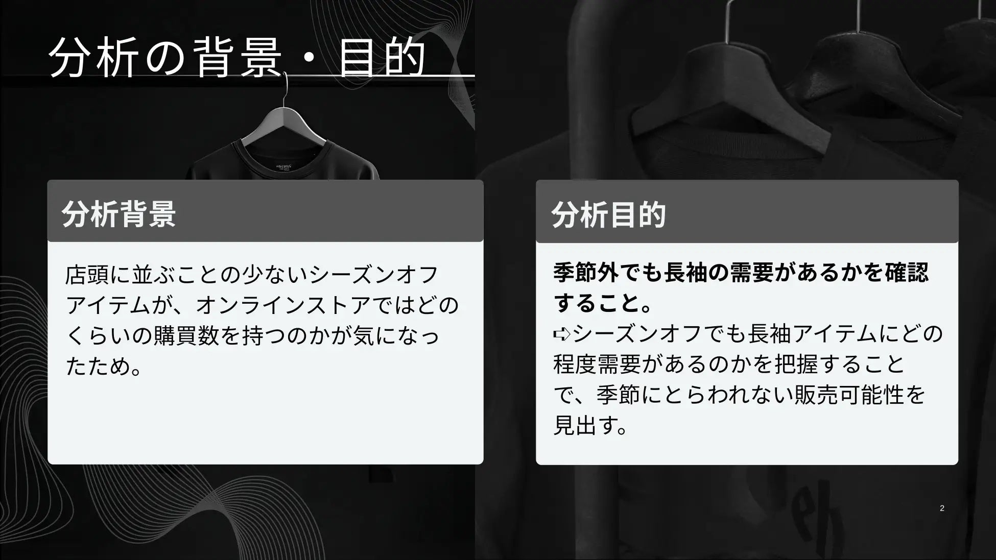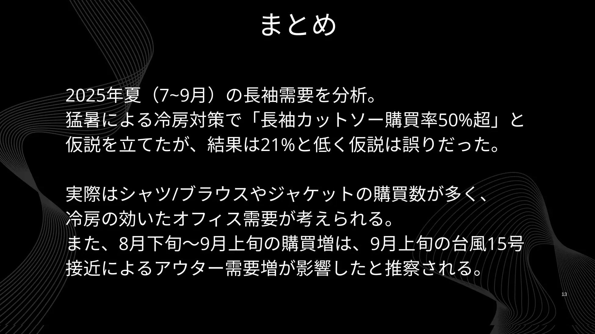 「温暖化の影響で夏は暑さを増し、人々の室内で過ごす時間が増えたからこそ、冷房対策のための長袖が必要とされているのではないか?」という仮説はとても筋道が立っているもので、かつ気候変動を受けて商品構成に苦戦しているアパレル業界にとってとても意義のあるテーマだと思います。