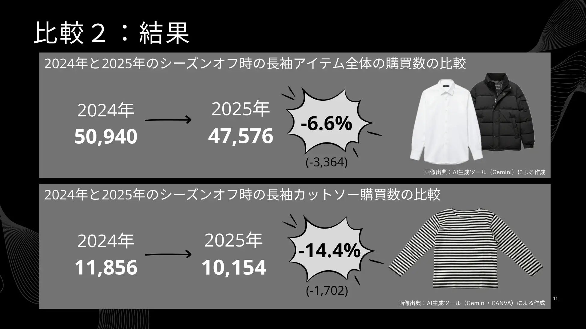 「2025年は2024年より長袖カットソーのニーズが高まっているのではないか?」という仮説自体は立証されなかったものの、そもそも2024年・2025年ともにカットソー全体の約20%が長袖だったという調査結果には十分示唆に富むものです。