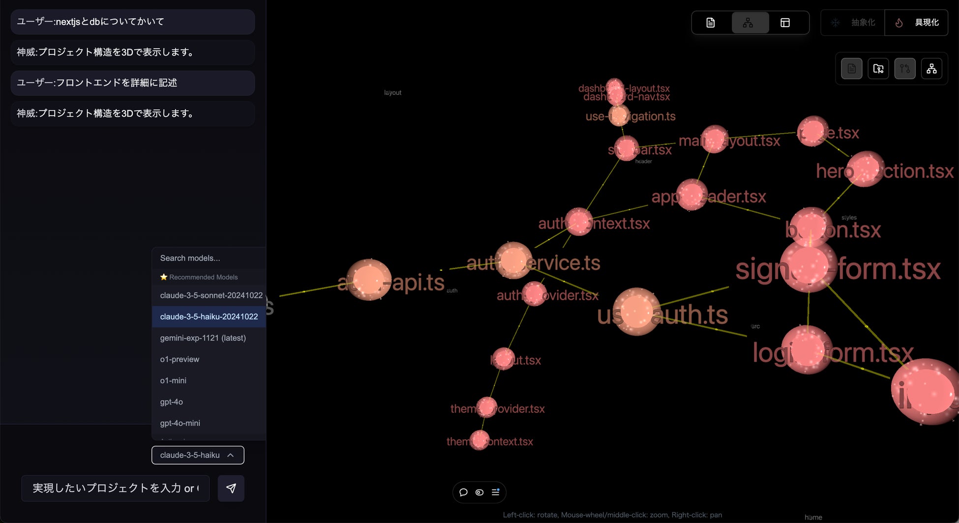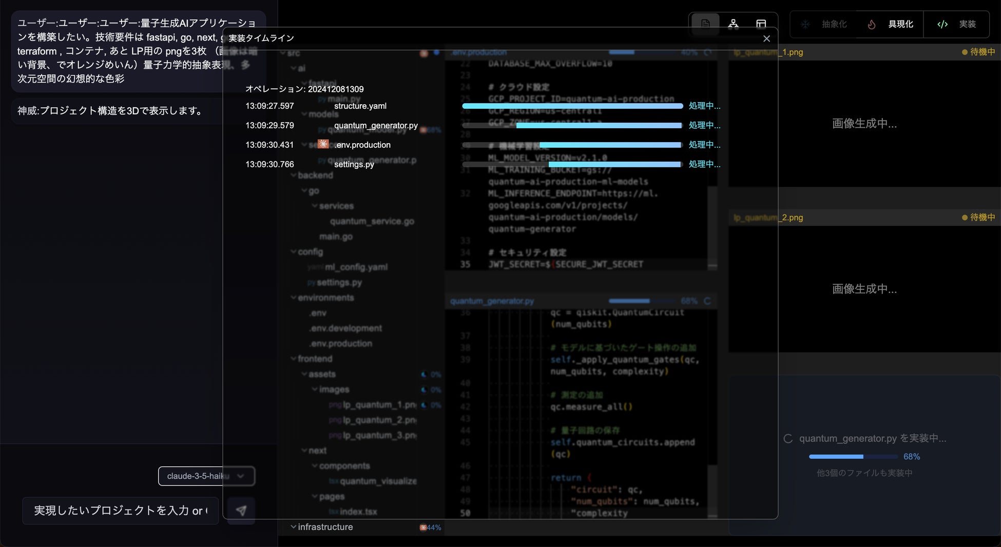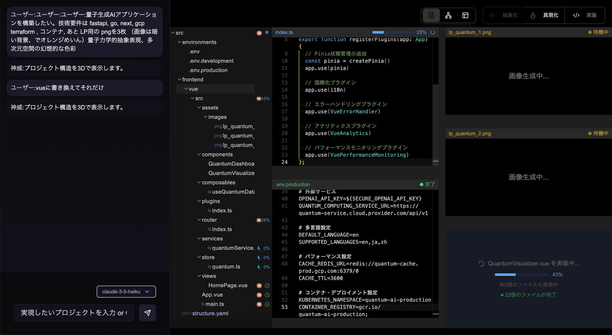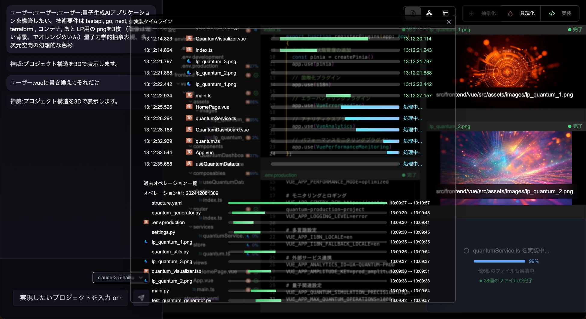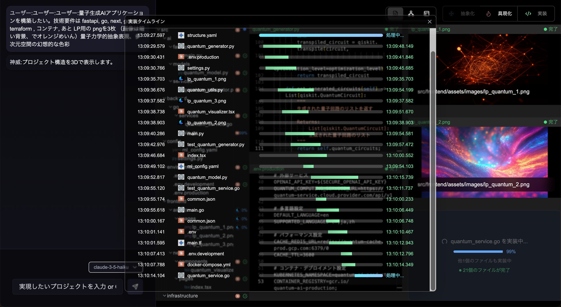 システム全体の設計から実装までを自動生成するAI技術。要件定義から始まり、アーキテクチャ設計、データベース設計、APIインターフェース定義、フロントエンド/バックエンドの実装まで、一貫したシステム開発プロセスを自動化。主な特徴:
