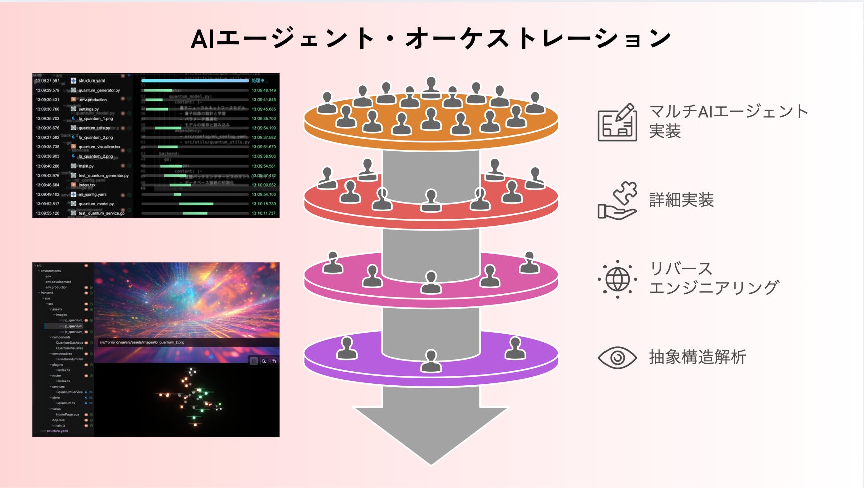 本リリースは、神威/KAMUIを基盤とし、新たなステージへと踏み出す「神統記/Theogonia」のアルファリリースに関するお知らせです。AIエージェント・オーケストレーション、設計・実装・再抽象化プロセス統合、そして将来の量子技術活用により当社は革新的なシステム開発の未来を切り拓いてまいります。