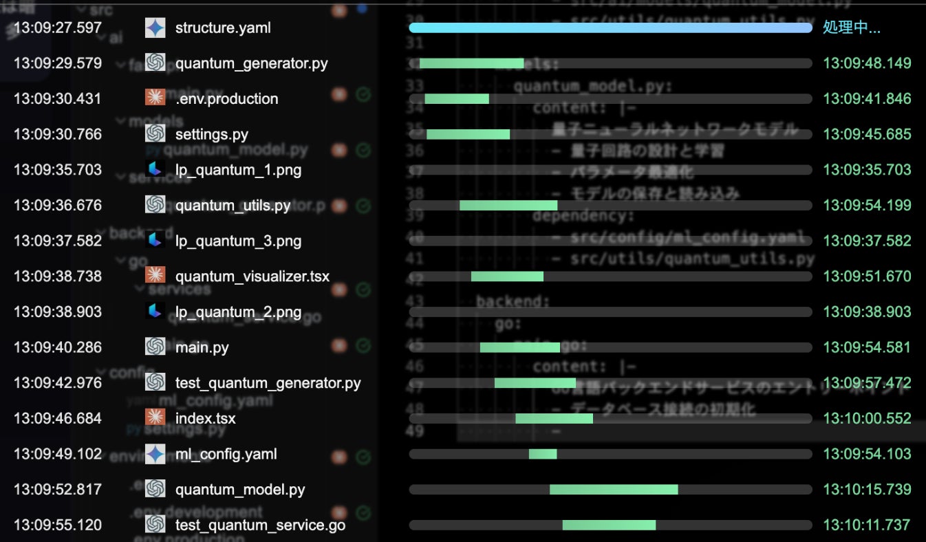 AIエージェントによるコード生成の様子。複数のファイルを並行して生成し、リアルタイムで進捗を確認できます。