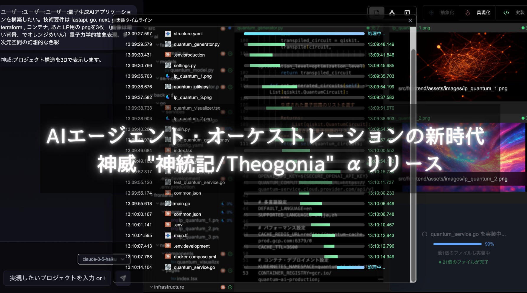 「神統記/Theogonia」は量子生成AIによるAIエージェント・オーケストレーション時代の先駆けとして、多層的なシステム設計・実装フローを効率化します。
