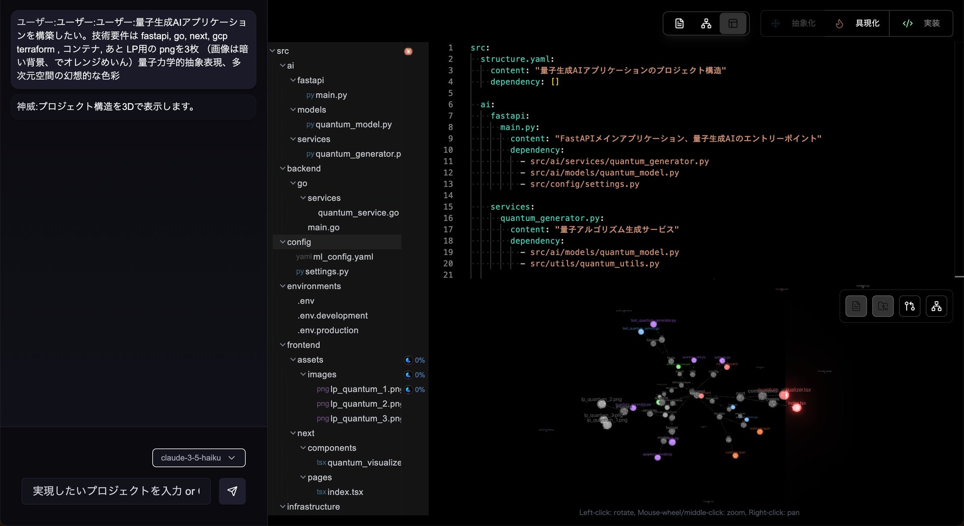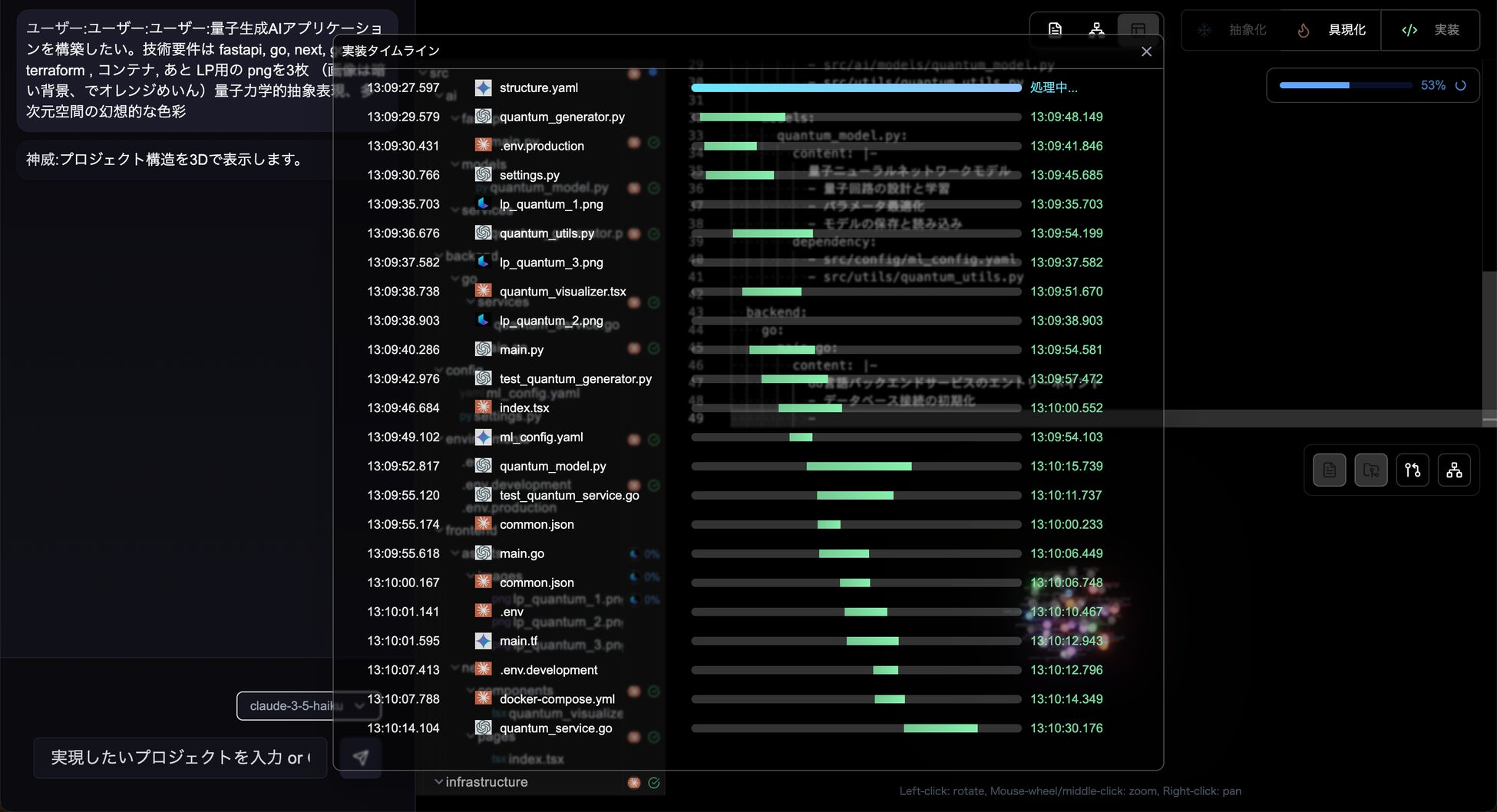 今回アルファリリースする「神統記/Theogonia」は、これらの技術を統合し、神威/KAMUI上で走る複数のAIエージェントを一元管理し、複雑なシステム開発を制御・可視化できる新ツールです。プロジェクト全体をガントチャートで俯瞰し、YAMLによる構造的な制御が可能となり、また研究済みである量子技術を活用したスケジュール最適化技術の導入を予定しています。