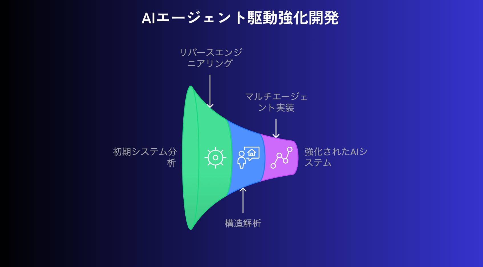 通常のシステム開発は「要件定義(抽象化)→設計→実装(具体化)」と進み、後から再度リバースエンジニアリング*6により「抽象化」し直すことは大変な手間がかかります。神統記/Theogonia*4は、この一連のプロセスをAIエージェント群*1が一貫してサポートし、設計から実装、そして再抽象化(仕様化)までシームレスに実現します。