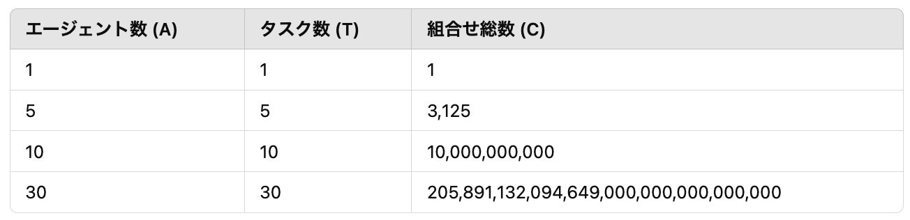 * 以下 AIエージェントx タスク数の組み合わせ総数(比例して計算時間も増加する)。エージェント数が2桁規模でもスケジュール問題解決に天文学的な時間を要する。