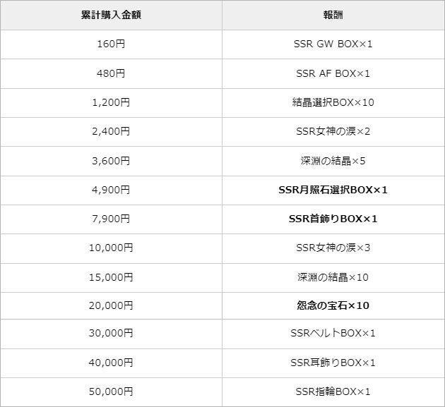 ▸累計購入金額60,000円以降は100,000円まで、10,000円ごとに「新緑のグランジュエル×1」を報酬として獲得できます。