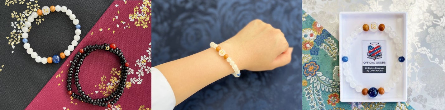 さらにSNSの投票でデザインを決定した、北海道コンサドーレ札幌の2024年3rdユニフォームの青と白を基調にした新カラーの念珠ブレスレットが新発売。メインの白珠はホワイトオニキスを使用し、親玉を含む3か所に青のカイヤナイト石を配置しました。アクセントに温かみのあるイチイの木製珠を使用しています。