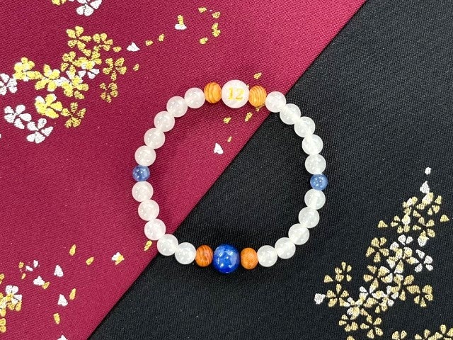 北海道コンサドーレ札幌の2024年3rdユニフォームの青と白を基調にした新カラーの念珠ブレスレットは、白珠にホワイトオニキス、親珠を含む3か所に青のカイヤナイト石を使用。アクセントの木製珠は、フクロウが止まるイチイの木をイメージしました。