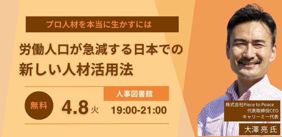 人事図書館にて1.5万人のプロ人材と2,500社をつなぐ大澤 亮氏をお招きし、新しい人材活用の可能性と業務委託・プロ人材の活用ポイントを学ぶイベントを開催いたします。