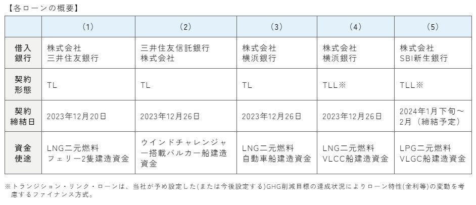 また、本フレームワークに基づき、トランジション・ローン(以下「TL」)3件及びトランジション・リンク・ローン(以下「TLL」)1件の融資契約を下記の通り当社グループにて締結を完了し、さらにTLL1件についても締結を予定しております(註4)。