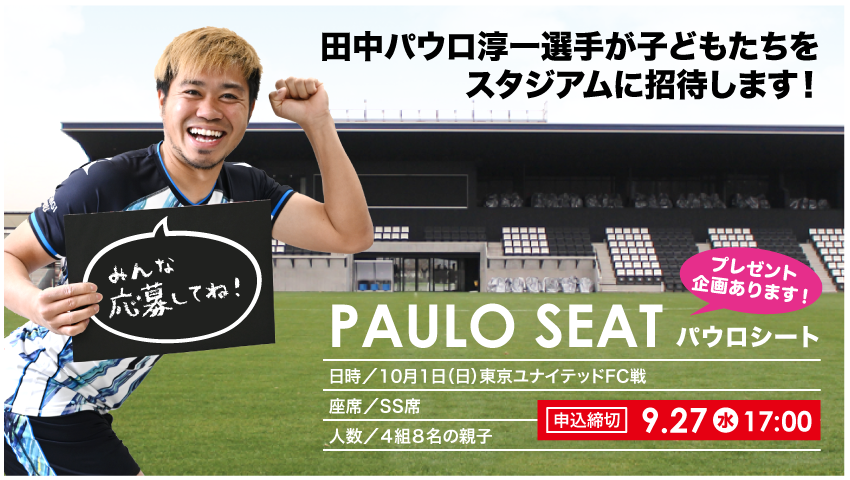 このたび、10月1日に開催を予定している関東サッカーリーグ1部後期9節東京ユナイテッドFC戦(14:00キックオフ@CITY FOOTBALL STATION)において、田中パウロ淳一選手プレゼンツの「PAULO SEAT」を設置することとなりましたのでお知らせいたします。